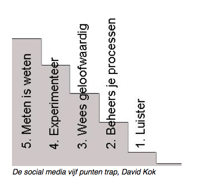 David Kok ontwikkelt een “social media vijf punten trap”, waarin de basis voor sociale media start met luisteren. En stelt zich de vraag “Waarom hebben de meeste gemeenten wel een (digitale) knipselkrant om te kijken wat er in het nieuws is geweest over de gemeente, maar hebben ze geen digitale knipselkrant om te weten wat er over hen is gezegd op de social media”. Je moet de sociale media ook weten in te bedden in je processen. En dat vergt dat je een duidelijke doelstelling hebt. Kok wijst ook op het belang van authenticiteit en geloofwaardigheid, het durven experimenteren en het belang van meten.